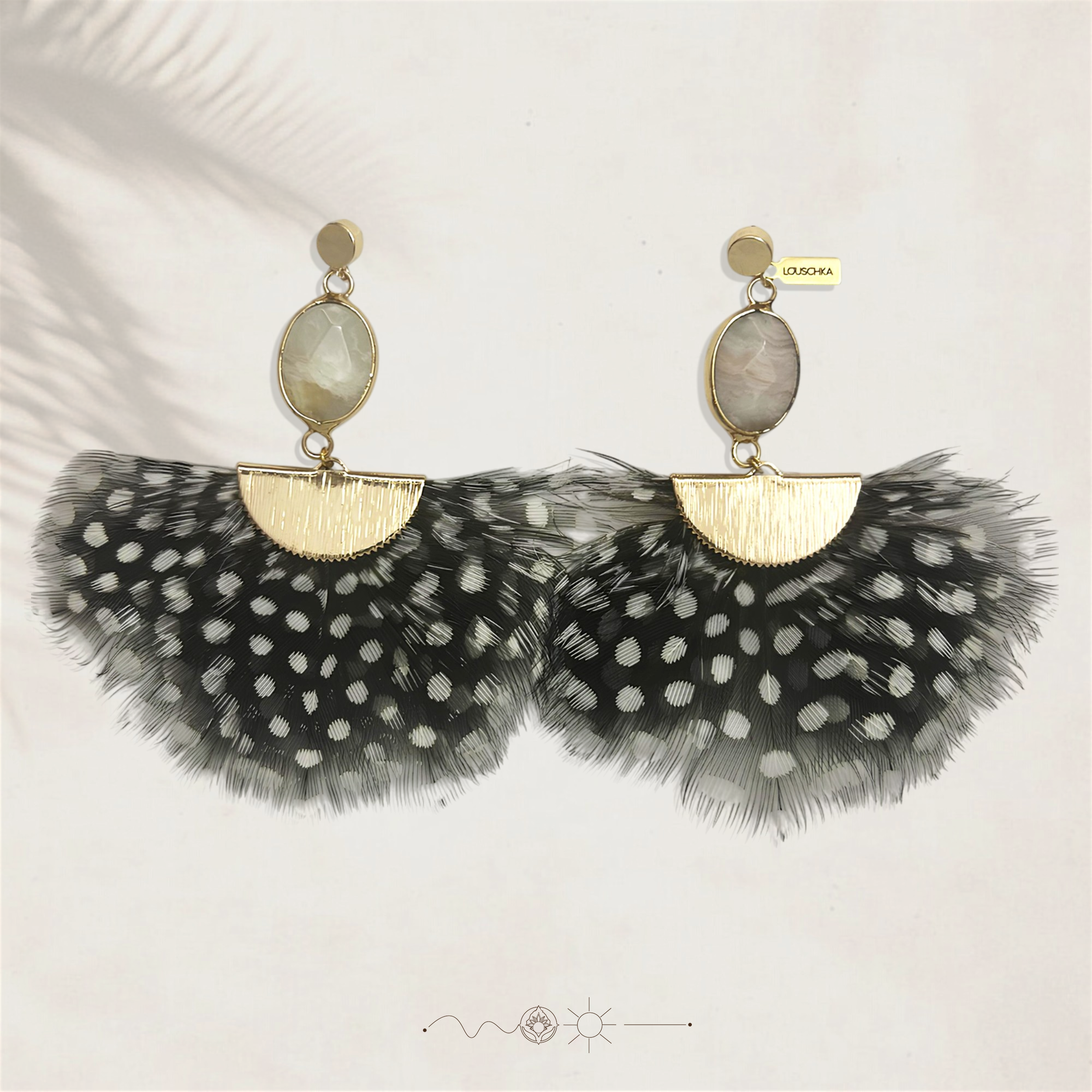 Plongez dans l’élégance sauvage avec » La Fascinante », une paire de boucles d’oreilles dorées qui marient subtilement des plumes mouchetées et des pierres naturelles. Ces boucles d’oreilles exquises fascinent pour ses imprimés et son alliance entre le noir et le blanc, parfaites pour celles qui recherchent à la fois le raffinement et l’originalité.