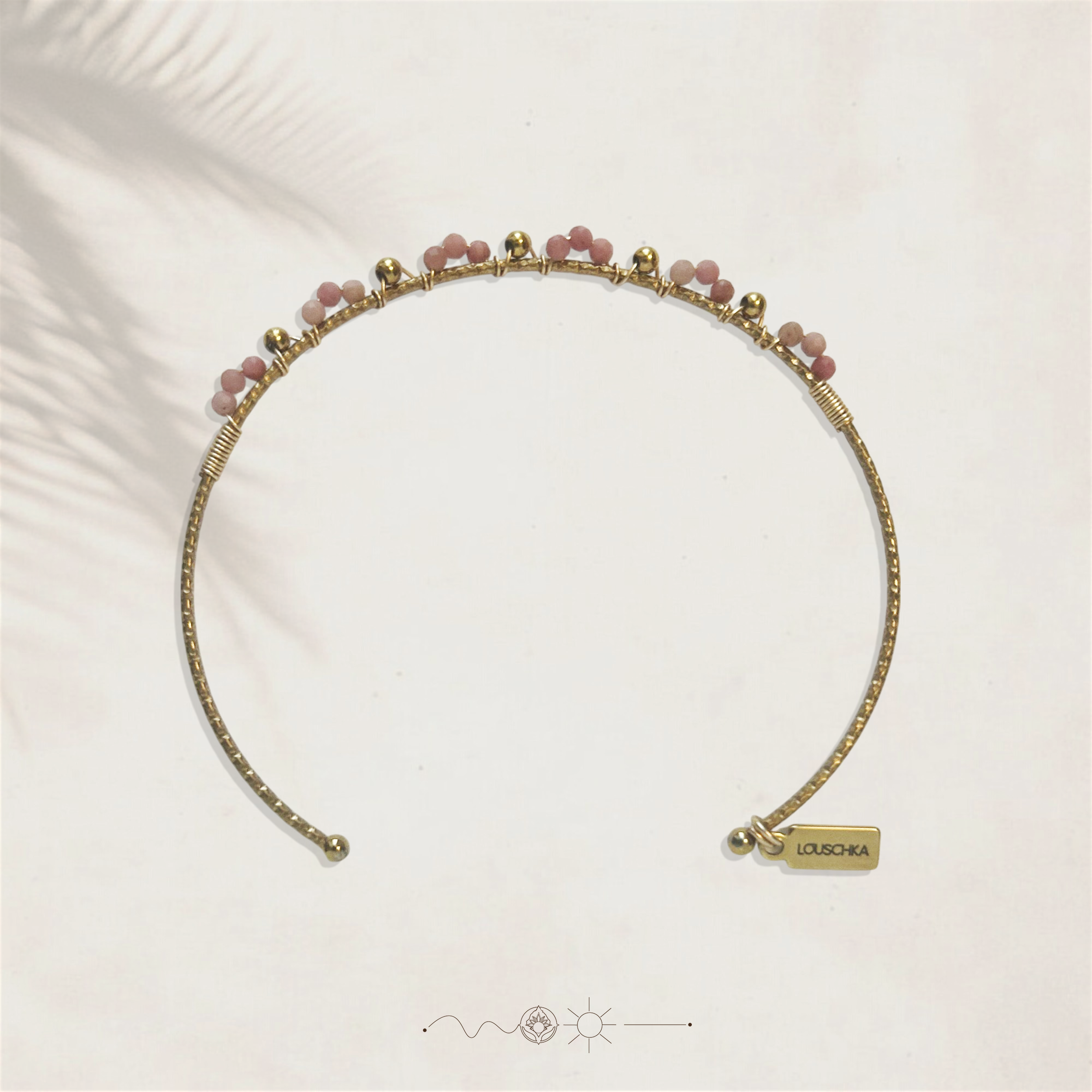 Elégance et minimalisme se rencontrent dans ce bracelet manchette réglable en acier inoxydable, ornées de petites pierres fines ou perles de verre aux teintes délicates.